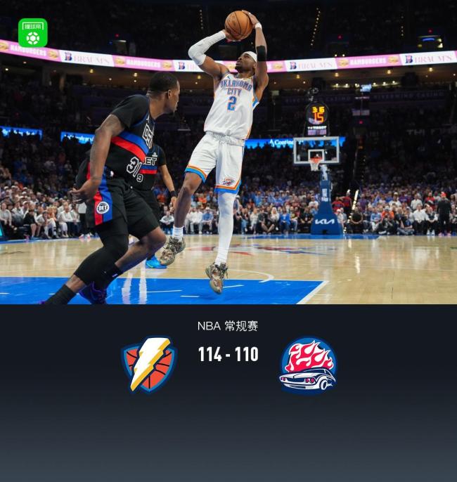 北京时间3月31日NBA常规赛,俄克拉荷马雷霆对阵底特律活塞。半场结束时雷霆以53-43领先,最终雷霆以114-110战胜活塞。