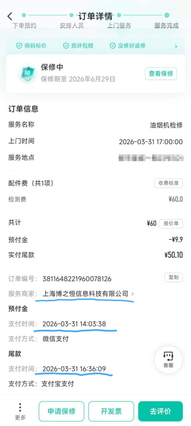 消费者沈女士介绍,事发当日15时30分左右,第一位师傅上门维修后收取了839元费用;16时15分许,第二位身着58同城工服、带有工牌的师傅上门了,这位师傅才是来自沈女士所下单的“博之恒”公司。随后,她在58同城APP“维权投诉中心”找到了另一个“幽灵订单”,商家是“闪修速修上海总店”。